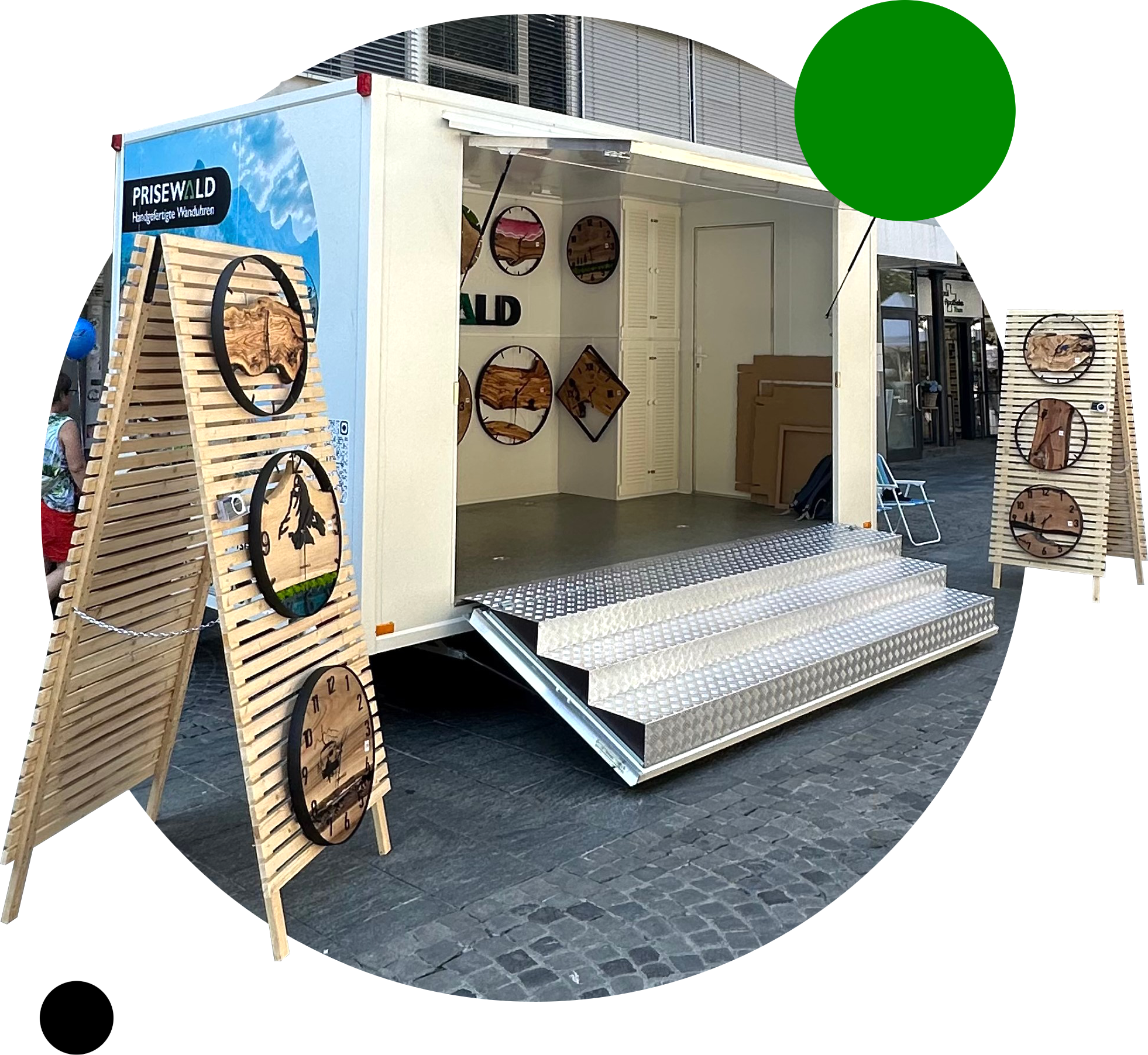 Schau inDer mobile Anhänger von PRISEWALD bietet die Möglichkeit, unsere Uhren an verschiedenen Standorten zu verkaufen. Unser Unternehmen hat jedoch seinen Sitz in Thun, daher findet man uns am häufigsten auf dem Markt in Bälliz in Thun. den Kalender, um herauszufinden, wann wir in deiner Nähe sind.