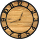 Runde Wanduhr aus Eichenholz, 50 cm, schwarzer Rahmen, Teilstriche Ziffern, Elchkopf, Berge und Tannenbäume