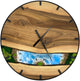 Runde Wanduhr aus Walnussholz, 35 cm, schwarzer Rahmen, arabische Ziffern, blaues Epoxidharz, grünes Moos, Insel, Küste